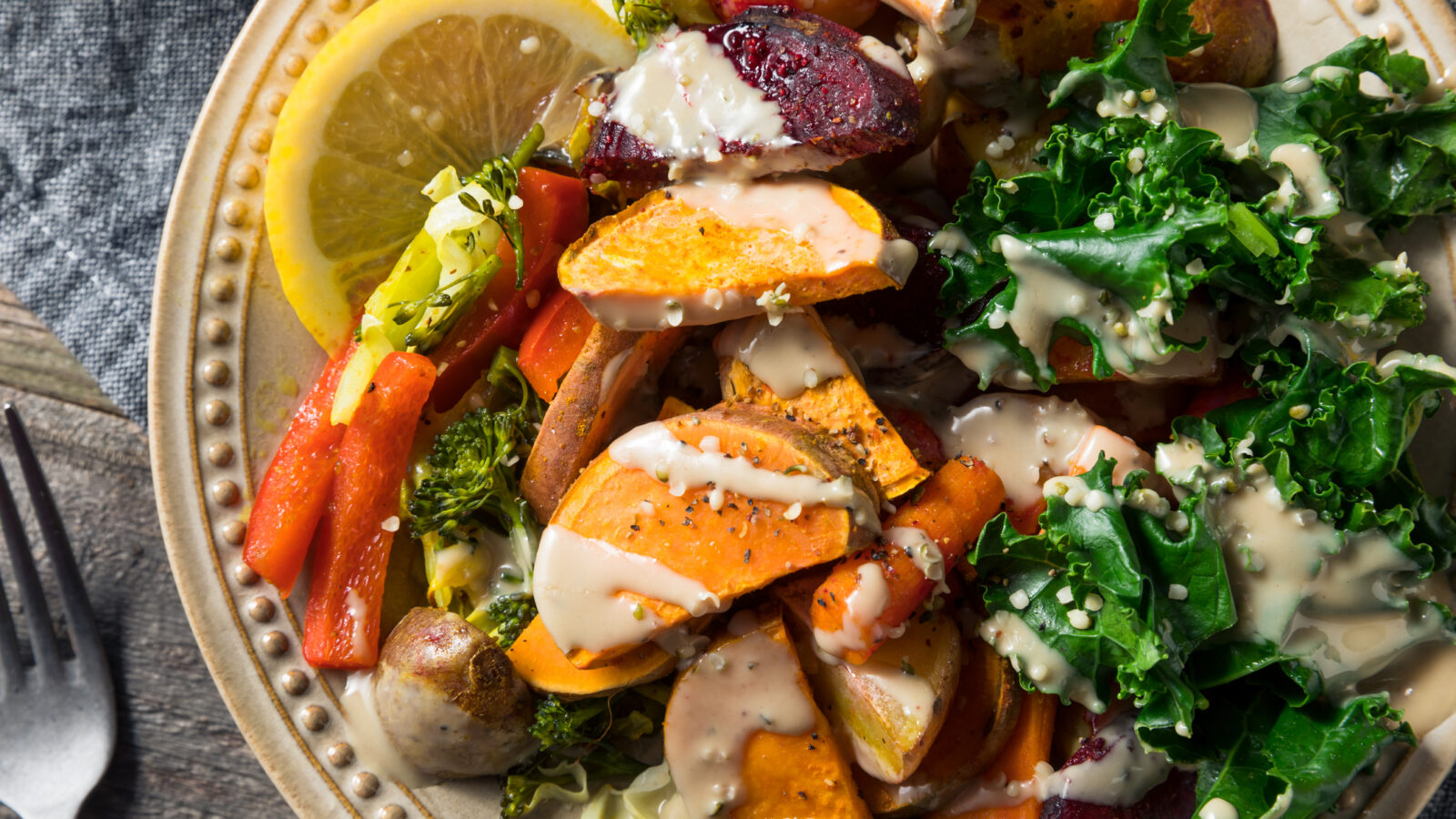 Divide the roasted vegetables among plates, add the kale and spoon the dressing on top. Top with seeds and a squeeze of lemon.